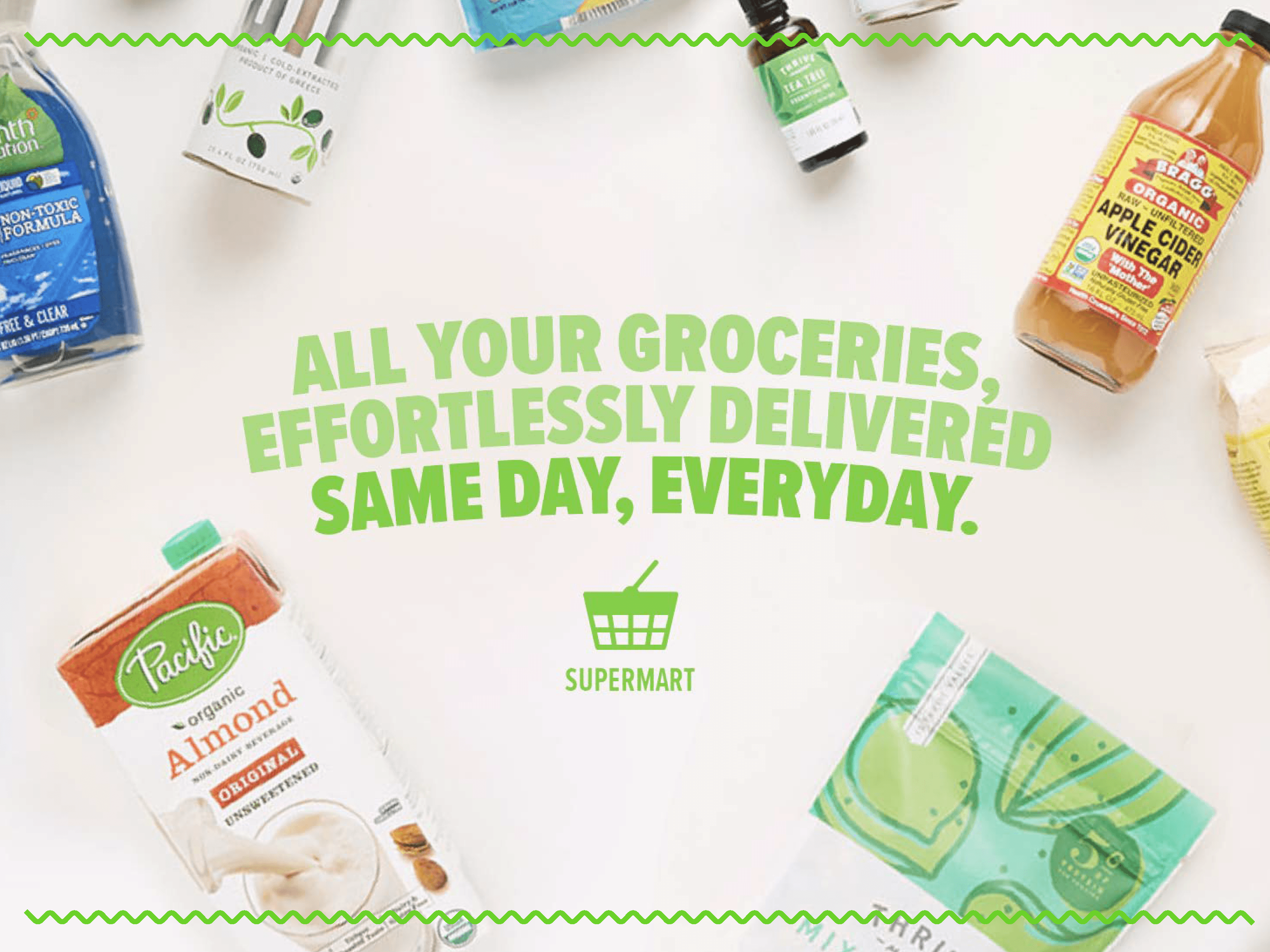 In addition to establishing the EXPRESS DELIVERY identity, we also started the process of looping in the existing SUPERMART brand and aligning it as a co-platform that would exist alongside the EXPRESS platform. We created a similar brand guide that expressed values and visual styles distinct from the main EXPRESS platform, but characterized them in a similar way so as to make its messaging clear and intuitive.