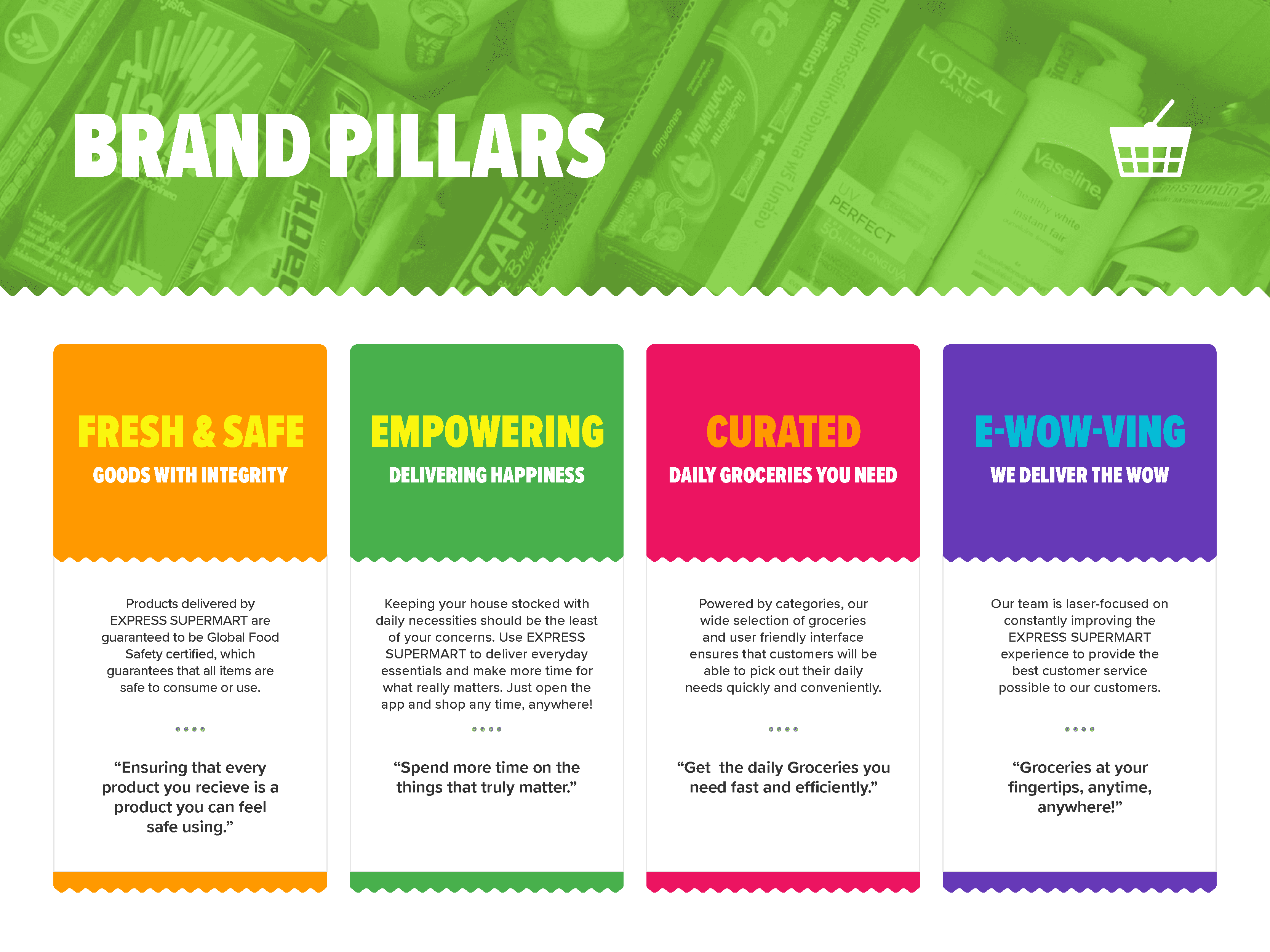 Our design goal was to establish the EXPRESS and SUPERMART names as distinct entities with the Lazada umbrella of services, which meant creating a system of mission statements and brand pillars with which we could align a visual language to. This resulted in the creation of a brand guide, along with a series of banners, templates, and email designs all of which helped articulate the precise nature of the EXPRESS and SUPERMART brands.